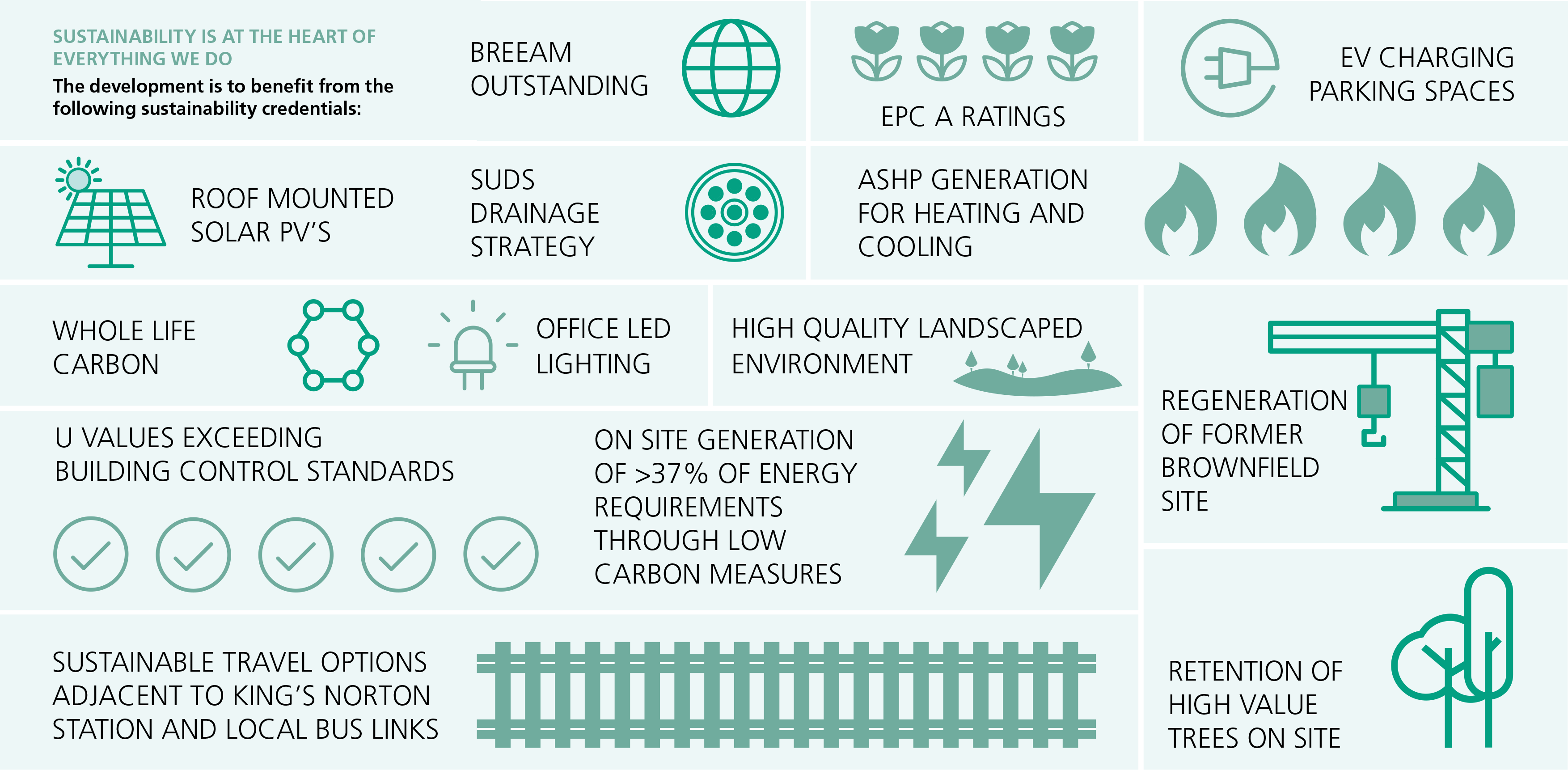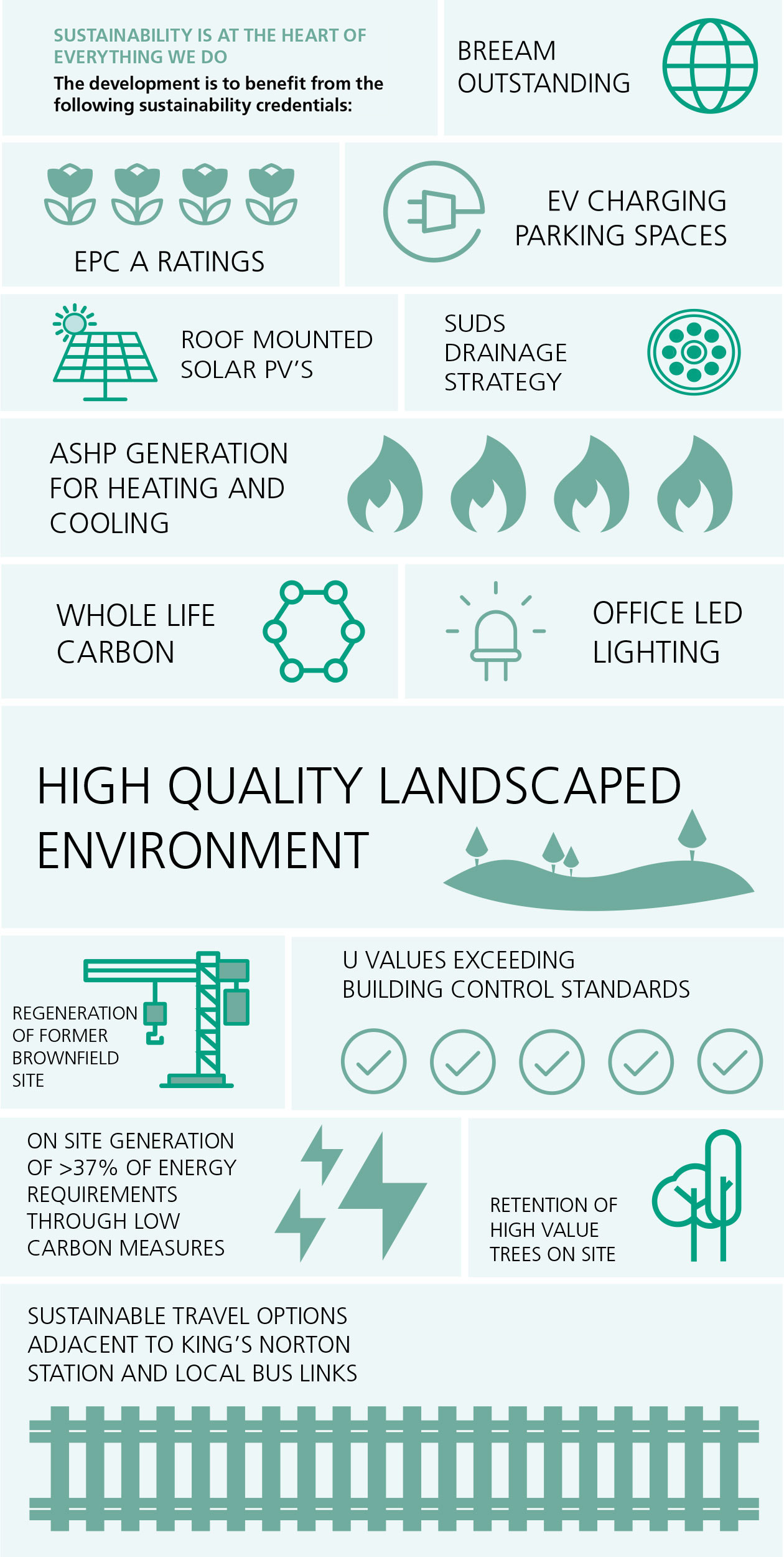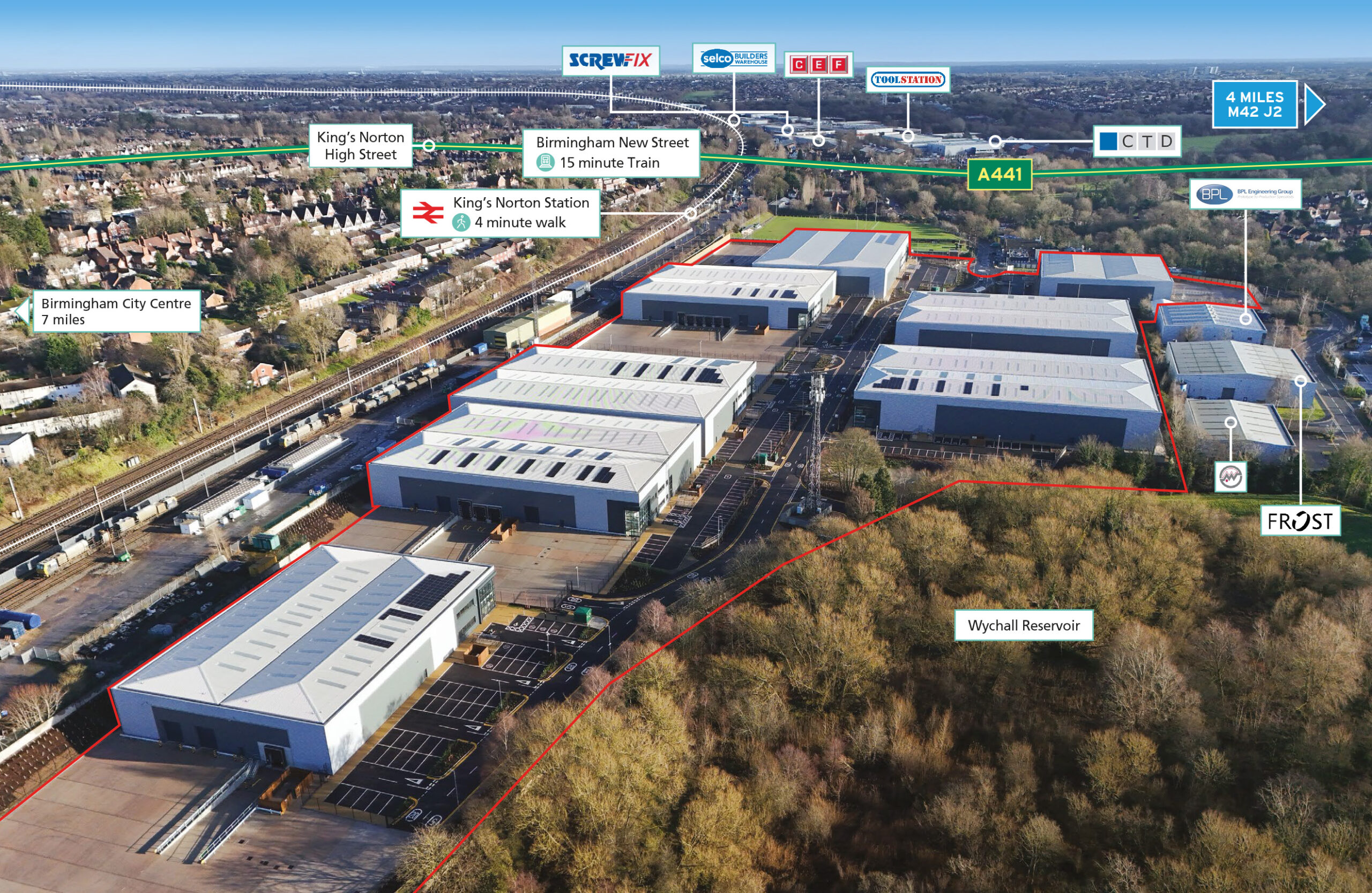 Urban8 is a new high tech urban logistics / manufacturing hub, strategically located in the heart of Birmingham. 8 cutting edge units offering the latest ESG amenities as standard. The scheme is set in green landscaped surrounds, providing inspiring spaces for employees to enjoy and relax. Urban 8 is situated within a 4 minute walk of Kings Norton Station with regular train services to Birmingham New Street and provides easy access to J2 M42 within 4 miles and Birmingham City Centre within 7 miles.
